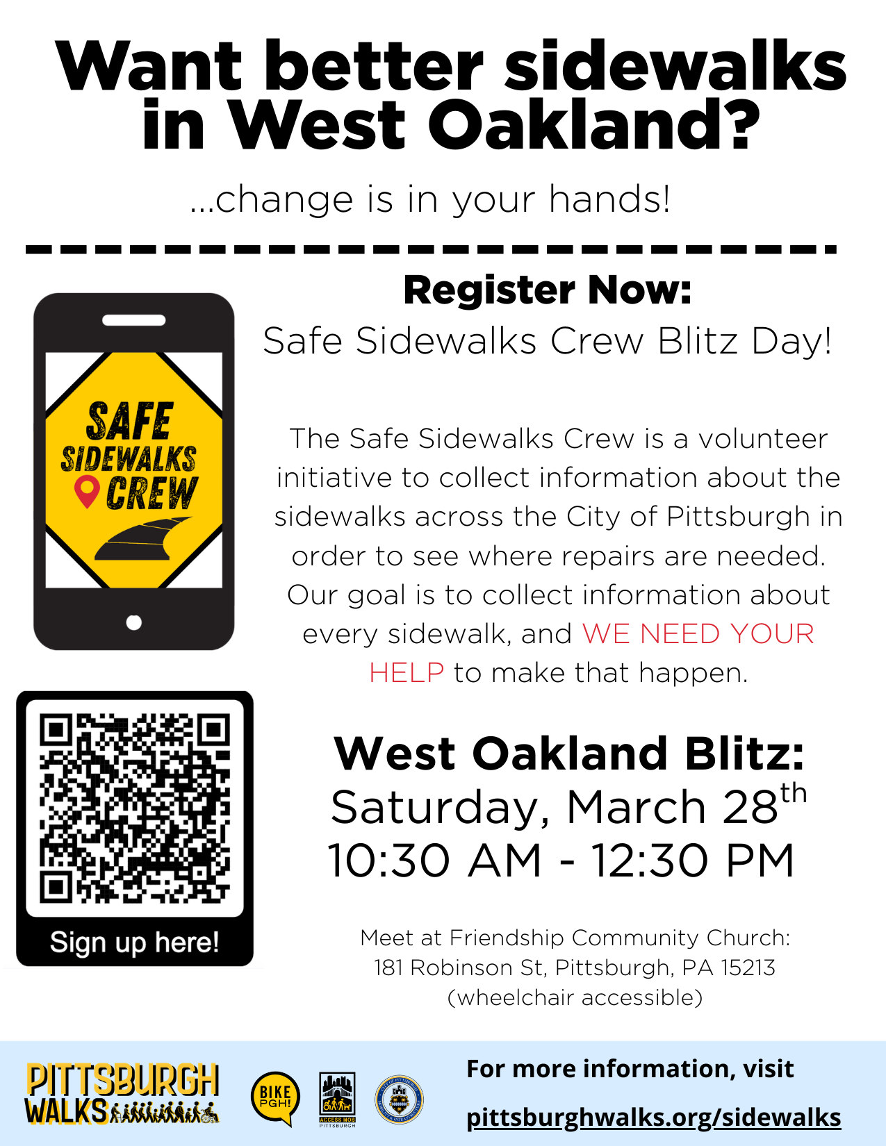 Back to All Events BikePGH Safe Sidewalks Blitz Day Saturday, March 28, 2026 10:30 AM 12:30 PM Google Calendar ICS